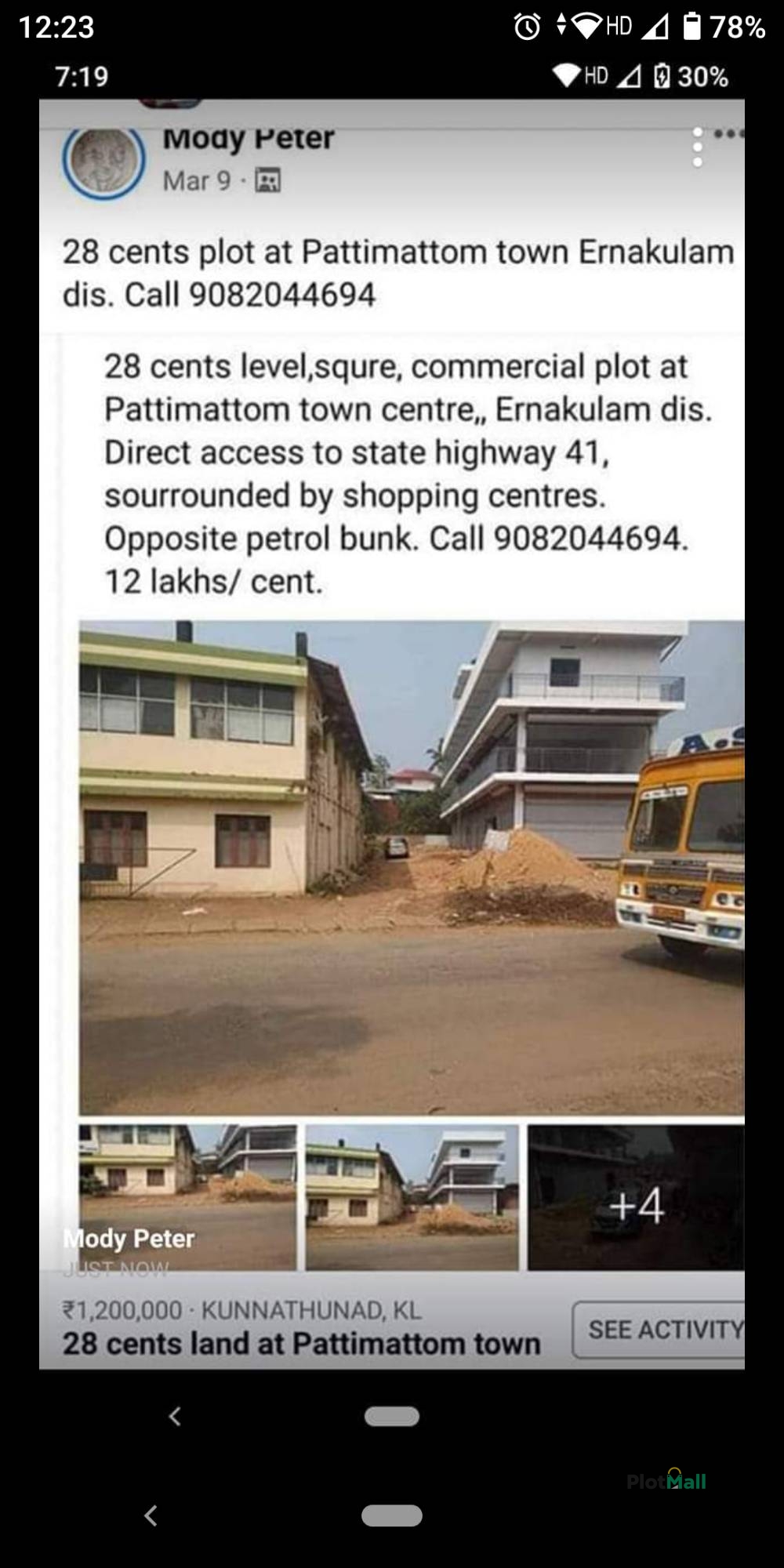 28 cent squre commercial/ Residetial plot at Pattimattom town, Ernakulam dis. Direct acess from state highway. second plot from state highway 41, good for flat, godowns , showrooms . Call 9082044694