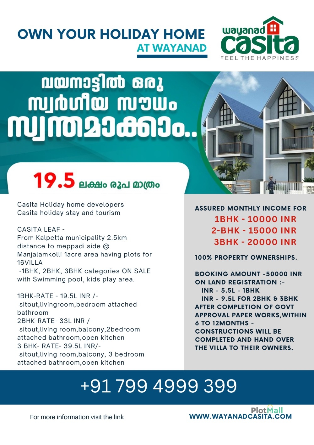 WAYANAD CASITA LLP Casita Holiday home developersCasita holiday stay and tourism CASITA LEAF -From Kalpetta municipality 2.5km distance to meppadi side @ manjilamkolli 1acre area having plots for 16VILLA -1BHK, 2BHK, 3BHK categories ON SALE with Swimming pool, kids play area. 1BHK-RATE - 19.5L INR /- sitout,livingroom,bedroom attached bathroom2BHK-RATE- 33L INR /- sitout,living room,balcony,2bedroom attached bathroom,open kitchen3 BHK- RATE- 39.5L INR/- sitout,living room,balcony, 3 bedroom attached bathroom,open kitchen ASSURED MONTHLY INCOMES FOR 1BHK - 10000 INR 2-BHK - 15000 INR 3BHK - 20000 INR 100% PROPERTY OWNERSHIPS. BOOKING AMOUNT -50000 INROn land registration :- INR - 5.5L - 1BHK INR - 9.5L for 2BHK & 3BHKAfter completion of Govt approval paper works,within 6 to 12months -constructions will be completed and hand over the villa to their owners.