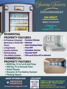 Cochin International Airport- 7 km, Athani Junction- 3 km. We are pleased to present a prime commercial space located at Sunny Towers, inclose proximity to Cochin International Airport, ideally suited for all kinds ofbusiness – (i) IT Company expansion & operations, OR (ii) Airline operations - its staff & trainees, offering seamless integration of living and working spaces in a secure and wellconnected environment, OR (iii) Banks and Financial Institutions, OR (iv)Polyclinics, diagnostic centers, wellness clinics, or other healthcare-relatedservices, OR (v) Educational/ Training Centers, OR (vi) Supermarkets &Restaurants, etc.The available spaces are as follows:(i)Commercial SpaceFirst Floor & Second Floor: over 3,300 sq. ft in each floor